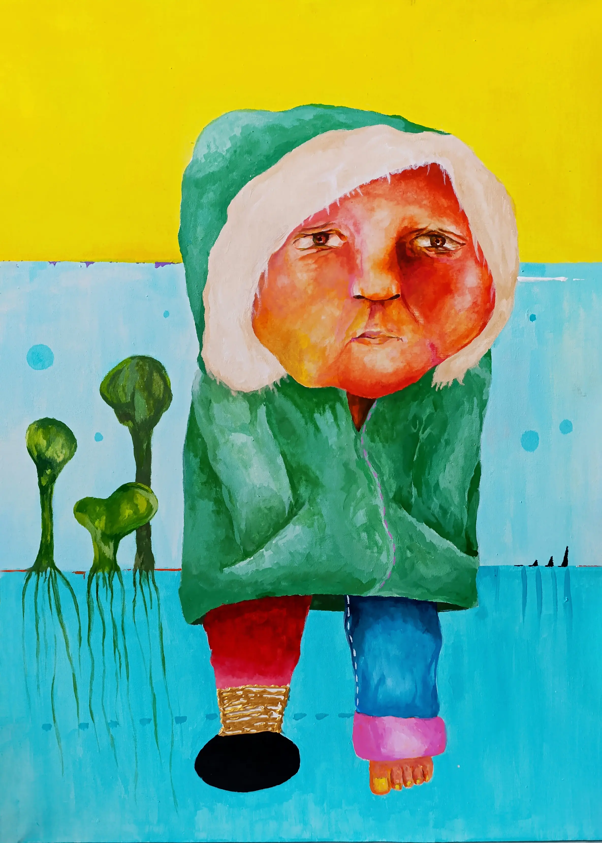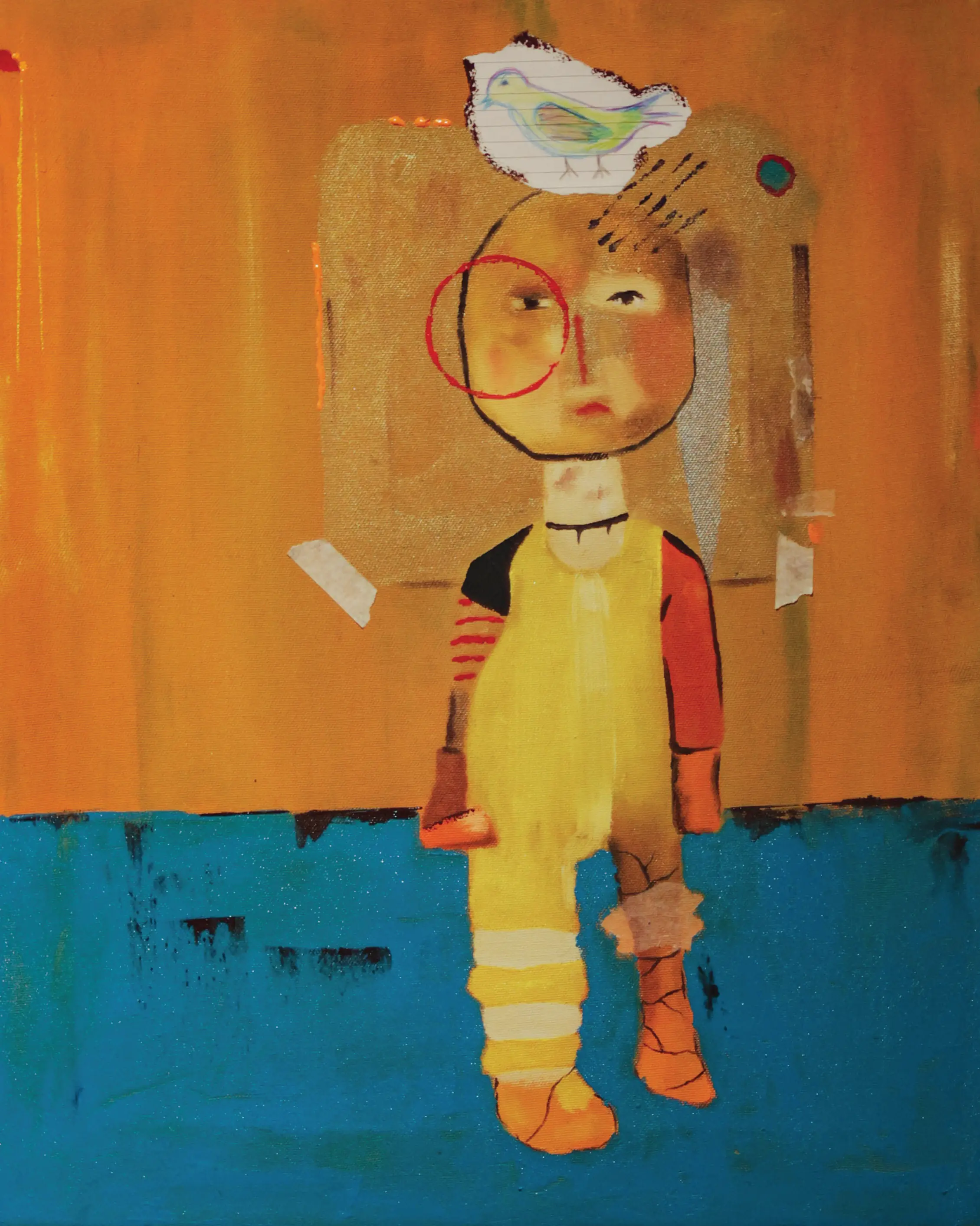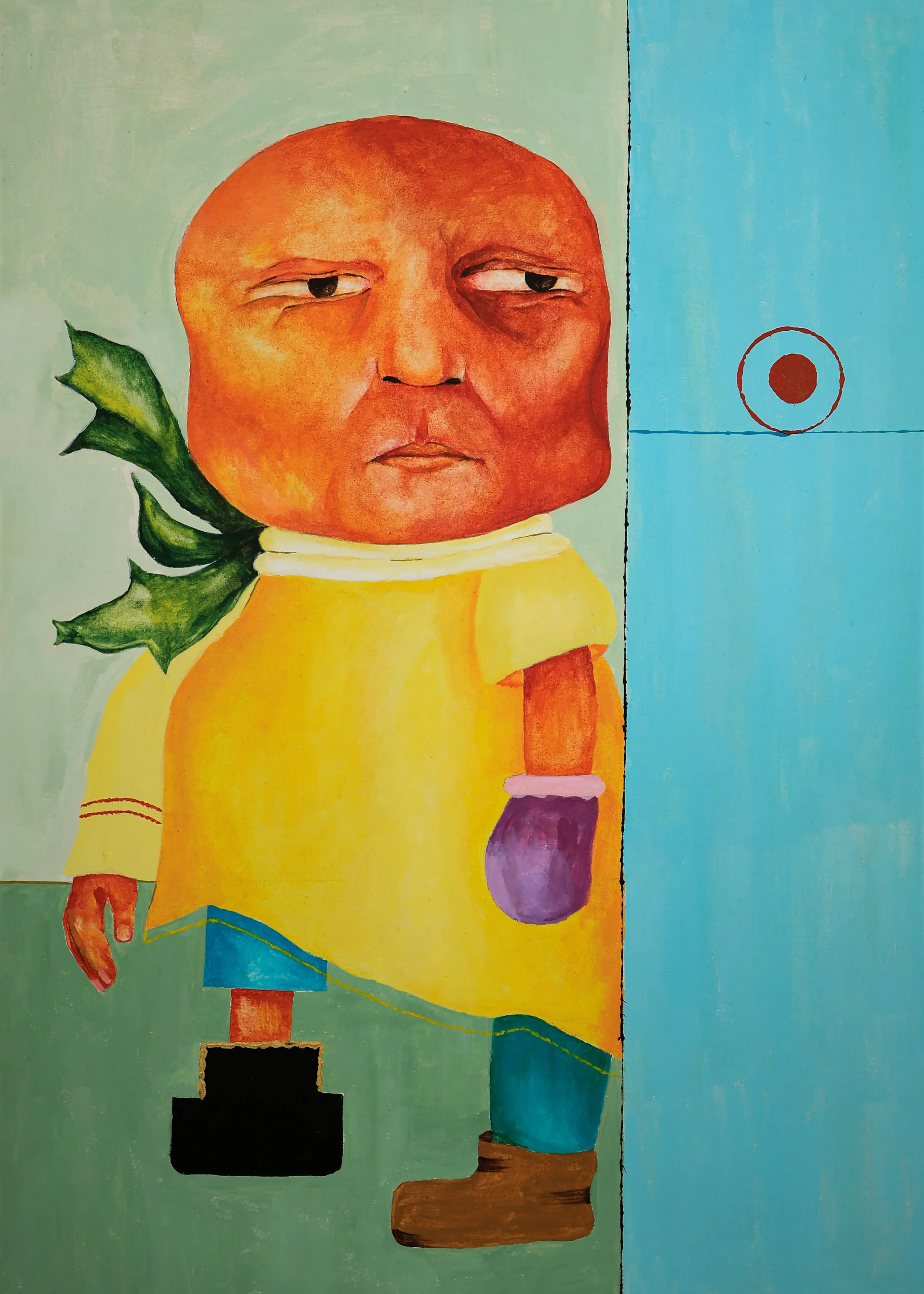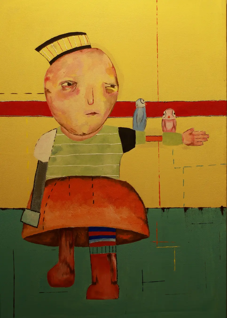 Working primarily with painting and experimental drawing, Abou Saada’s visual language combines figurative elements with symbolic distortions of the body. Her works often feature simplified forms, unusual proportions, and expressive colour. These characters exist within minimal or ambiguous spaces, allowing the focus to remain on the internal narrative of the figure itself.
